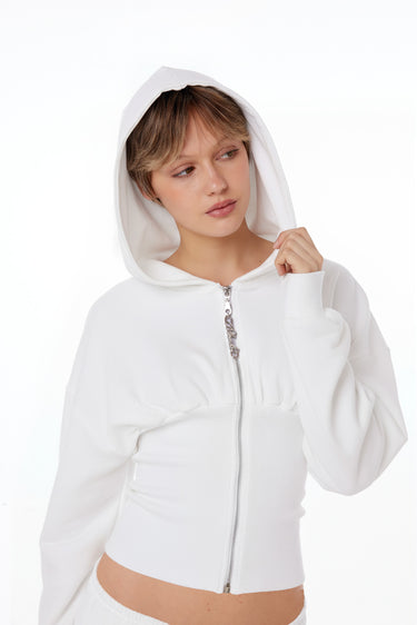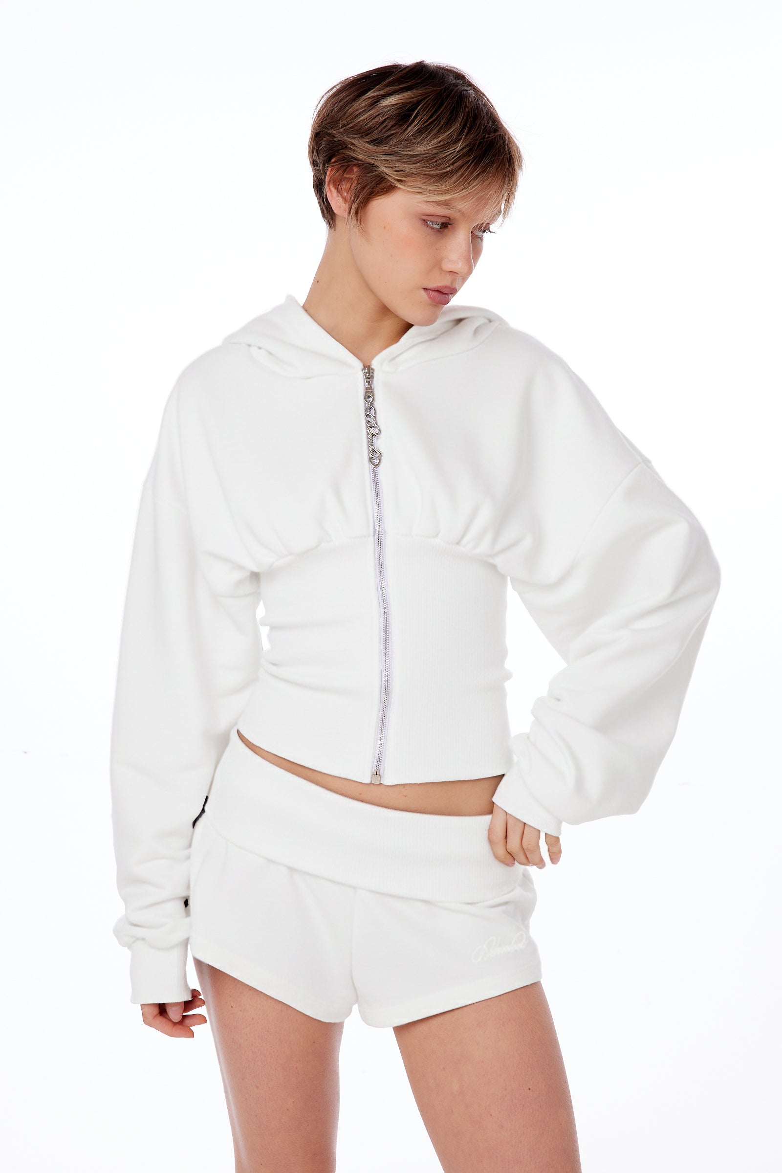 Hoodie de rústico color blanco con cintura encorsetada. Cierre desmontable ykk con chapita "blkmba" Ribb en cintura y puños.