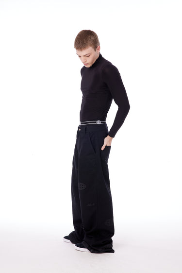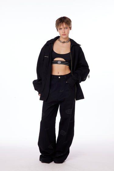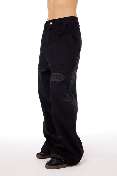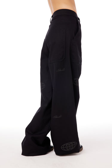 Pantalón de gabardina negra con estampado worldwide y blkmba. Bolsillos en delantero y espalda.