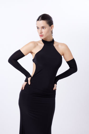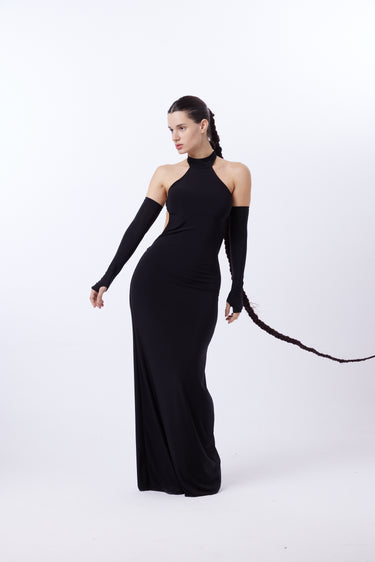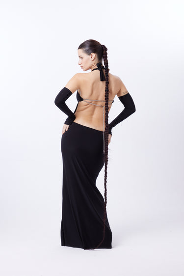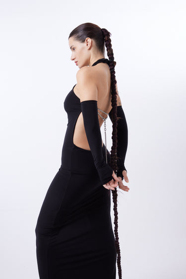 Vestido de microfibra color negro. Cuello halter con tiras para anudar en cuello. Cadenas en espalda regulables. NO INCLUYE MITONES.