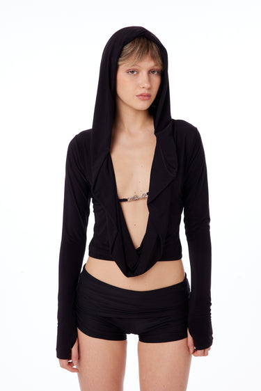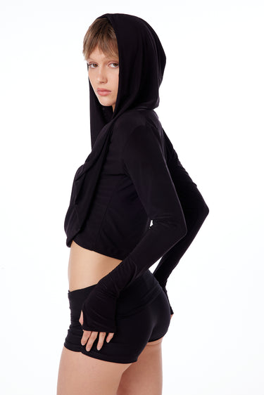 Top de microfibra manga larga con dije "blkmba" en centro. Tiene capucha y puño mitón en ambas mangas.