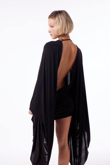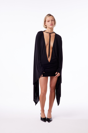 Vestido de microfibra mangas largas con espalda y escote abiertos. Tiene una tira para anudar que es desmontable y que regula el escote.