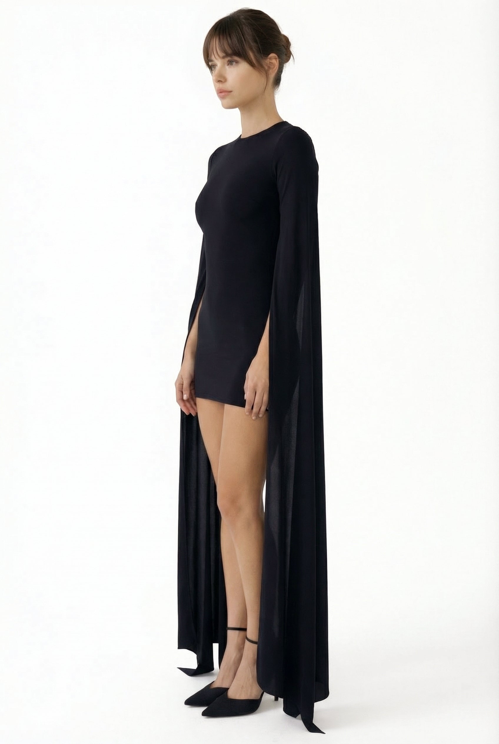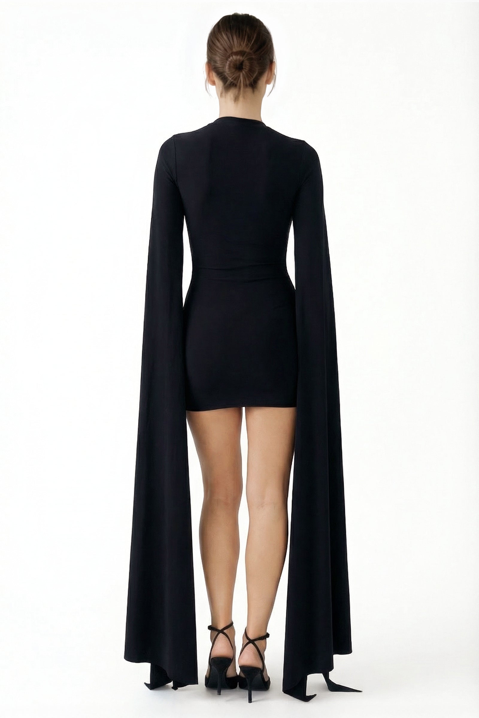 Vestido mini de microfibra con mangas extra largas y con abertura para sacar el brazo.