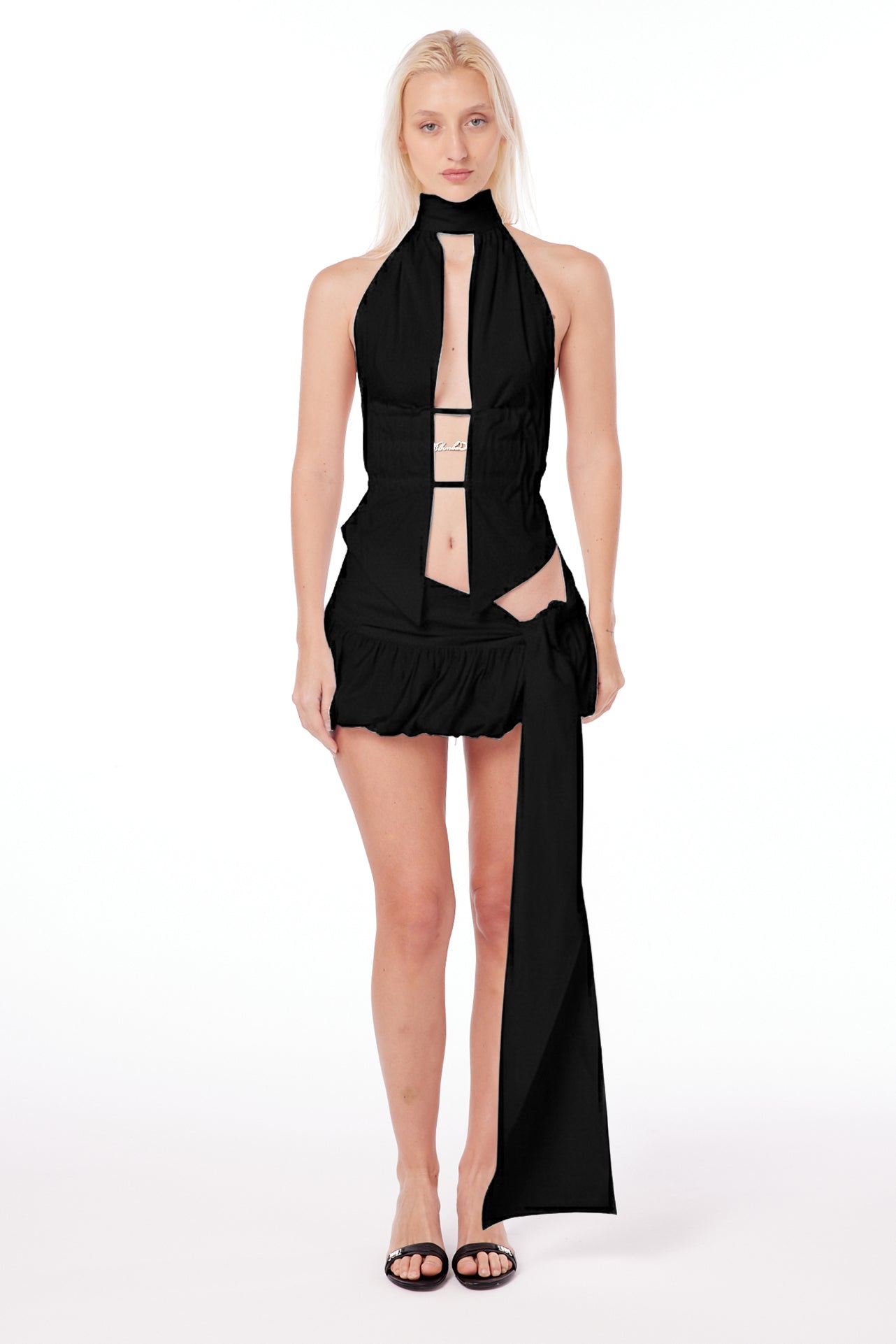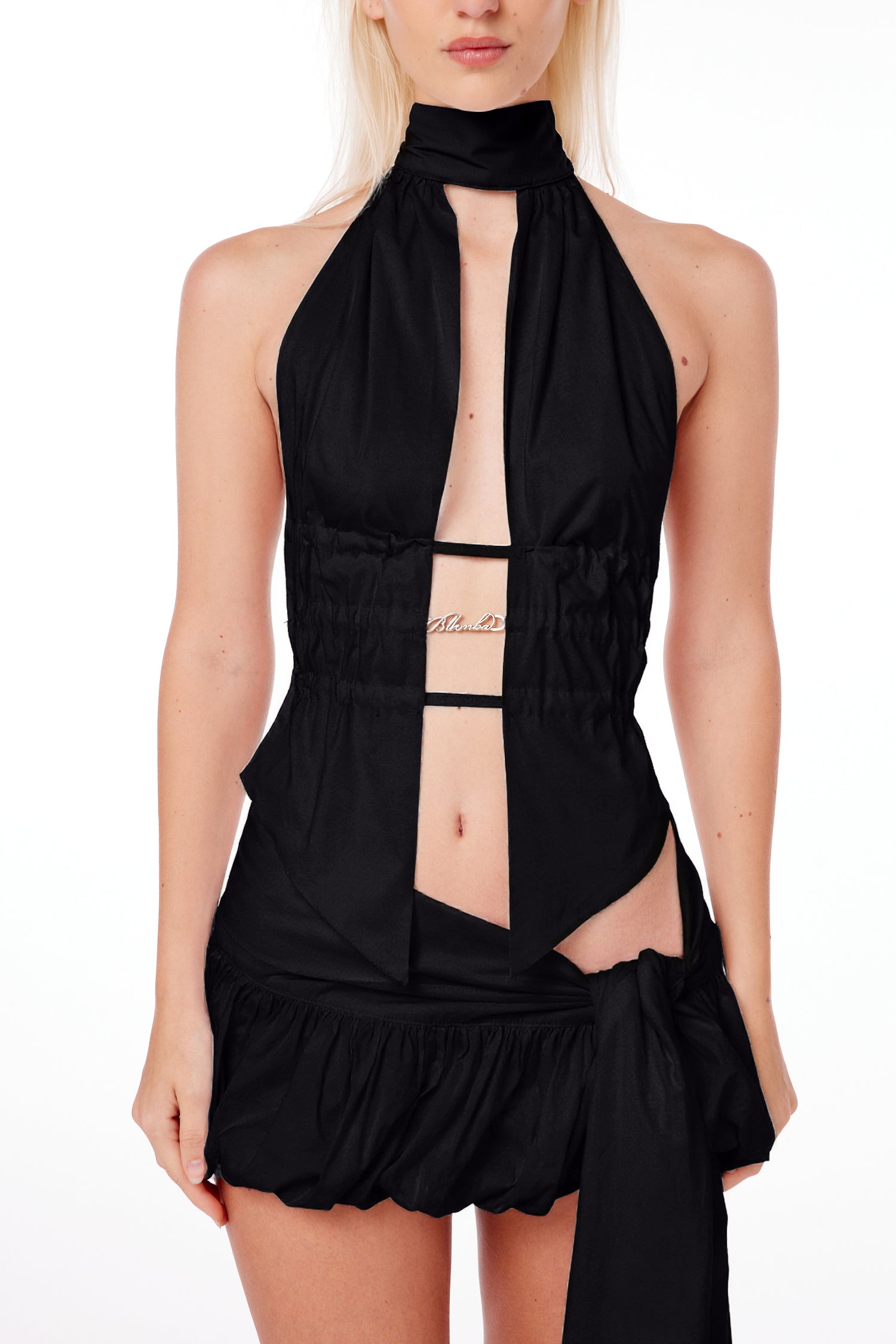Top de poplín color negro con tiras para anudar en espalda y cuello.